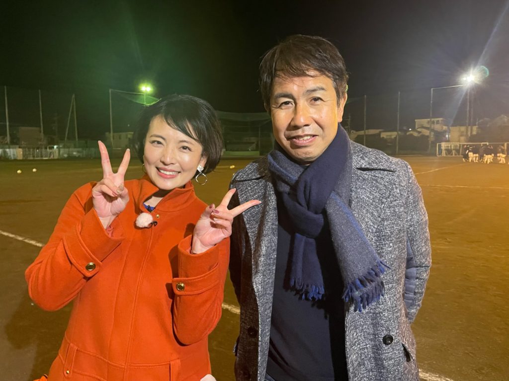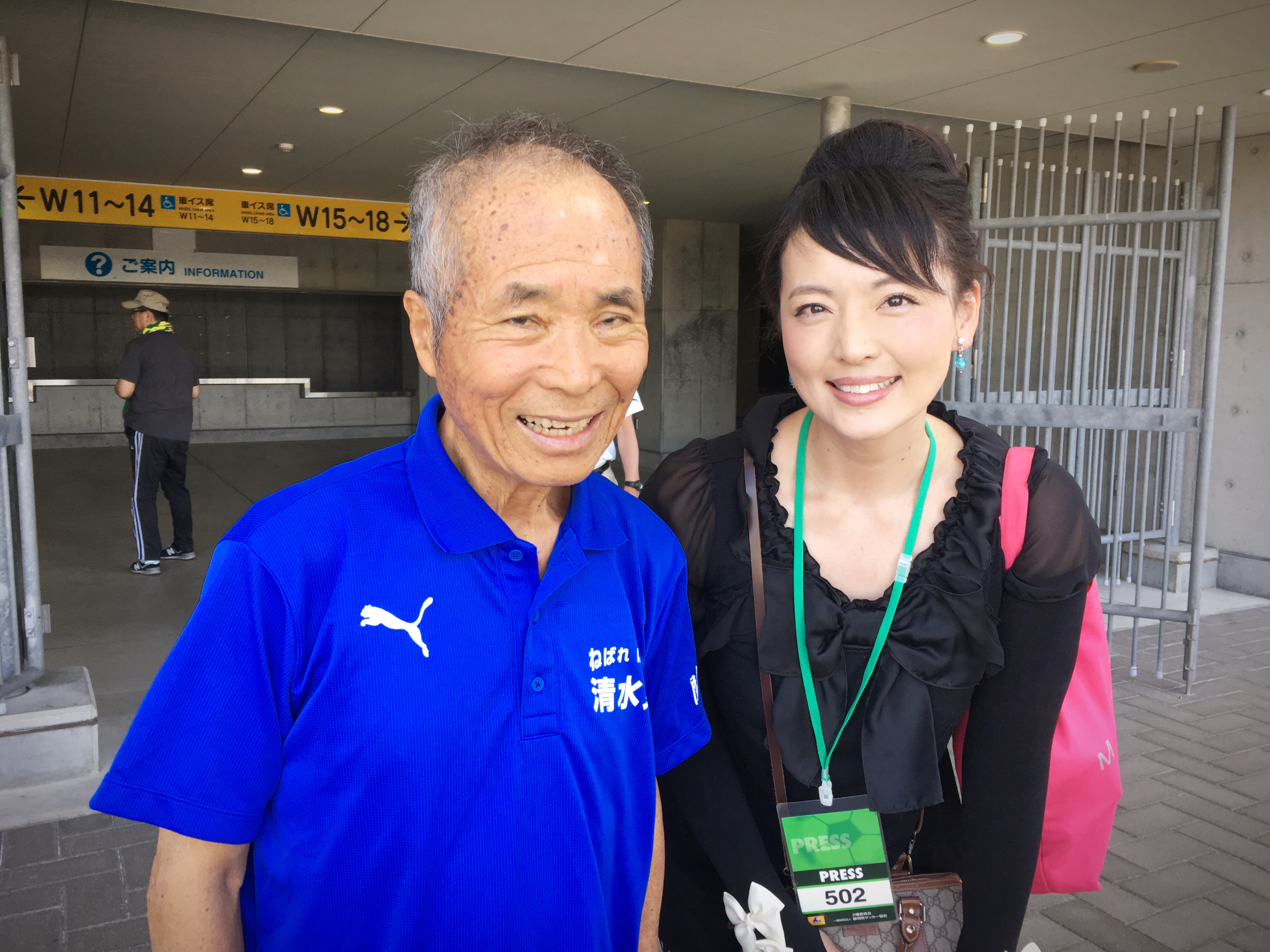 そして、一番のレジェンドと言っても過言ではないでしょう。1982年度の全国選手権でチームを初優勝に導いた元監督の故・勝澤要さん。2017年のインターハイ決勝(vs静岡学園)で、エコパに応援に行った時の写真です。勝澤先生が私に気づいて下さり「小沼さん、いつもテレビ楽しく見ているよ。カンカン帽のコーナーはいいね。あなたの温かい人柄が出ている」と言って下さったことを忘れません。トークショーの中で反町さんも「サッカー本体よりも、礼儀、人間性を教え込まれた」とおっしゃっていた通り、私を褒めて下さったのもアナウンサーとしてのテクニックではなく「人柄」でした。清水東サッカー部のイズムを私にも当てはめて下さったようでとても嬉しかったことを覚えています。