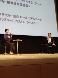 我らが清水東高サッカー部は、全国高校選手権に6度出場、1982年度の優勝1回、準優勝3回という成績をおさめています・・・が、今は全国の舞台からは遠ざかってしまっています。古豪復活のカギをテーマにサッカートークを展開しました。前半は、清水東OGの私だからこそできる「清水東&サッカー部あるあるトーク」でお客様にも笑って頂き嬉しかったなぁ~。特にウケたのは、清水東サッカー部伝統の「センスパン」。先輩が後輩にお金を渡し、「お前のセンスでパンを買ってこい」という恐怖の買い出しなのですが、2年前のロケで大榎さんが「これを言いだしたのはソリさんのはずだ」とおっしゃっていたので、その真相をトークショーの中で尋ねると… 「多分オレだ」とのお答え✨(内田さんの時代にはセンスパン制度はなかったそうですが、私の代のサッカー部はセンスパンを知っていたので)、少なくとも15年間は脈々と続いています。センスパンの言い出しっぺが反町さんというウラが取れたのは、元報道記者として大きな仕事をした気分でした\(^o^)/