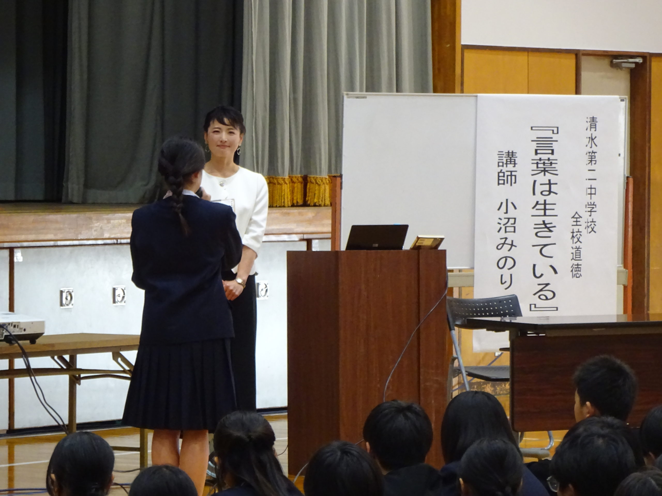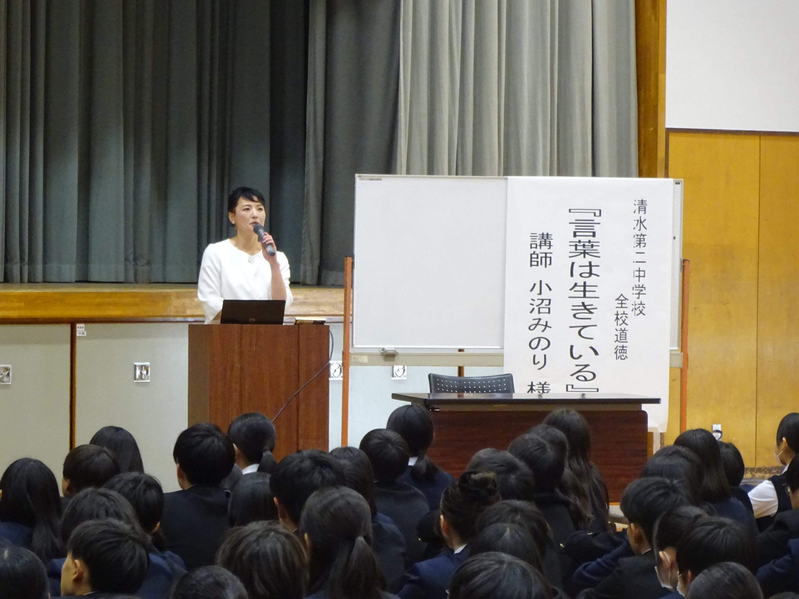 娘が小沼さんの講演を聴講し感動して帰ってきました!言葉のお話を聞くと聞いていたので「正しい言葉遣い」や「敬語」のお話だったのかと思いきや、全く違う方向に振れた、魂を揺さぶるお話だったとのこと(聴講したママ友に聞きました。私はパートのため行けませんでした泣)、二中生のために熱いお話をありがとうございました!